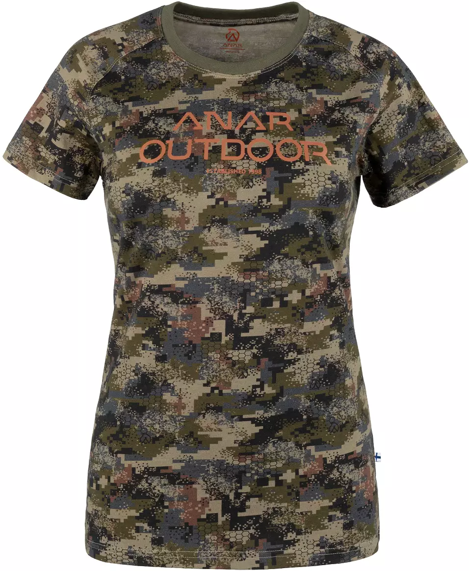 Weiches T-Shirt aus Bio-Baumwolle in Camouflage-Farben, mit femininer Passform, ideal für Jagd und Freizeit. Das Material ist elastischer Baumwolljersey und fühlt sich angenehm auf der Haut an. Das T-Shirt hat eine normale Größe und einen runden Halsausschnitt. Auf der Vorderseite befindet sich ein Anar-Druck.