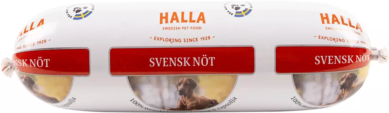 Halla Svensk Nöt on maukas täysravinto aikuisille koirille, joilla on normaali aktiivisuustaso. Ruoassa ei ole lainkaan kanaa, ja se valmistetaan Ruotsissa käyttäen lihaa, sisäelimiä ja vihanneksia ruotsalaisilta tiloilta. Ruoka on luonnostaan hyvin sulavaa ja vatsaystävällistä.