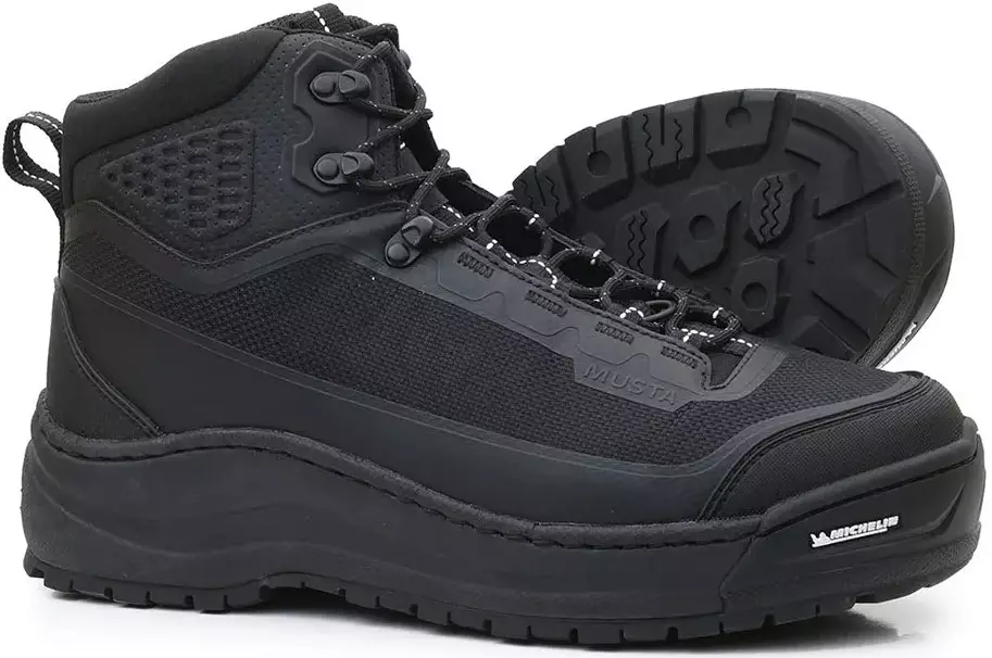 Musta Hiker on kevyt 5 tuumaa korkea kahluukenkä, jossa on TPU-vahvistettu nailonpäällinen. TPU-vahvikkeet kuluvimmilla alueilla takaa pitkän käyttöiän ilman, että kengästä tulee liian raskas. Kengän pukeminen on helppoa ja se kiristyy myös helposti. Vahvuutta lisäävät ompeluraitojen omat urat, ja EVA-välipohja sekä Soles by Michelin -pohjan etuvanne on ommeltu kengän päälliseen. Kengän suunnittelussa on otettu huomioon vaellusominaisuudet, ja se tarjoaa mukautuvan istuvuuden ja tukea pidemmille vaelluksille, joten se on ihanteellinen niille, jotka kävelevät pidemmästi kalastuspaikoilleen. Matala nilkka, mukavan pehmeä mutta tukeva vaahtomuovikaulus mahdollistaa enemmän liikkuvuutta verrattuna korkeampiin kahluukenkiin.